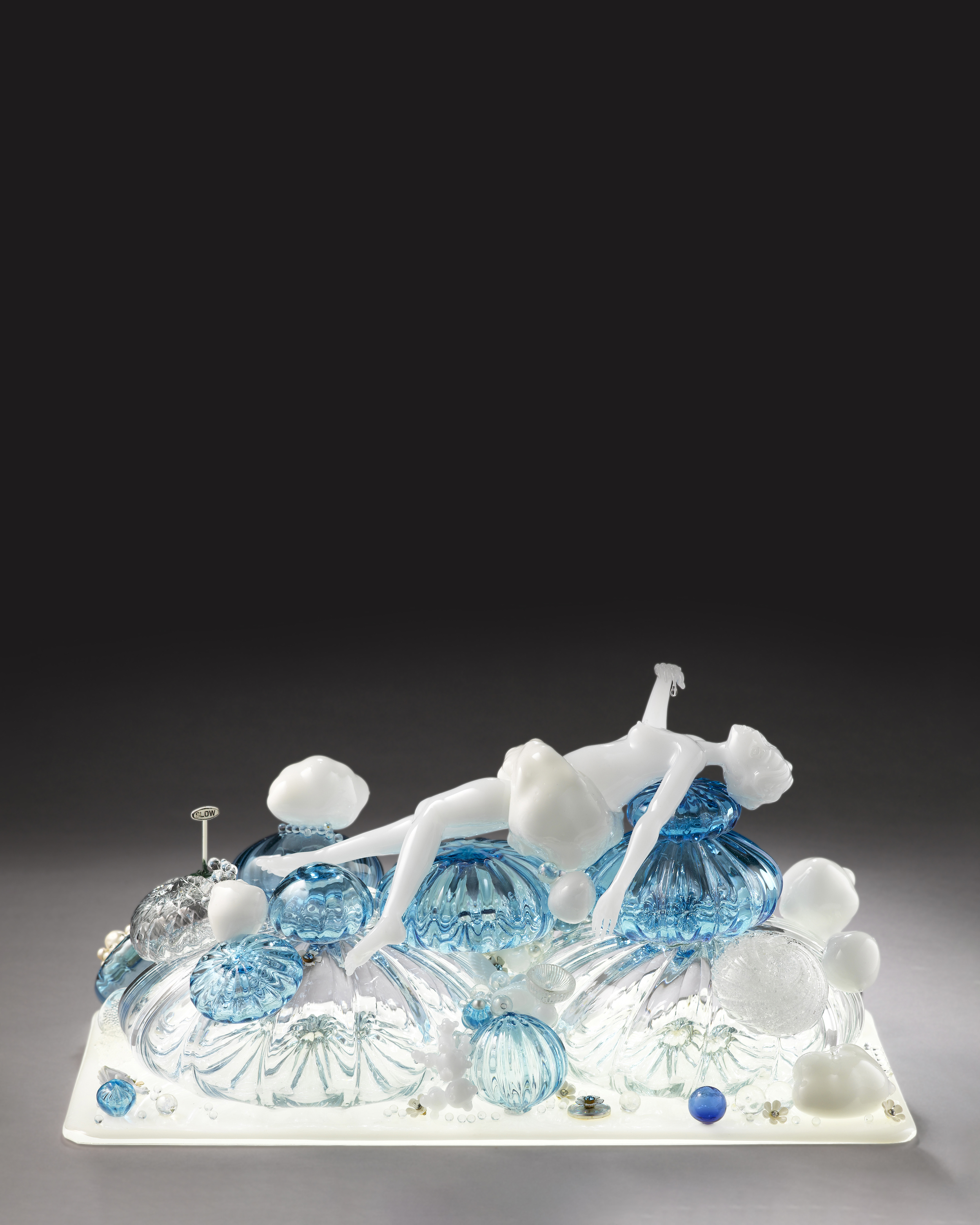 Lozar has been known for elegantly flameworked figures set in tableaus that are at once macabre and darkly humorous. In rent work the comic relief has given way to gravitas. The work now addresses big life issues; the kids growing up and, of course, oblivion. There is sadness and then there is redemption, the fallen tree germinating, protecting and nursing.